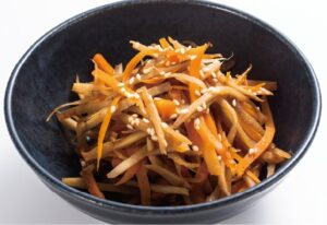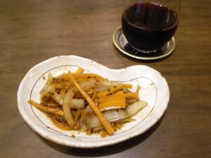 好きな前菜はいろいろあるが、「キンピラゴボウ」もそのひとつだ。ゴボウをゴマ油で炒め、醤油やみりん、唐辛子で味付けをした定番の家庭料理だ。ほんのり香るゴマ油の風味とあの独特の噛み応えが味覚を刺激し、ワインとも好相性であるため、ついつい杯が進んでしまうのだ。
