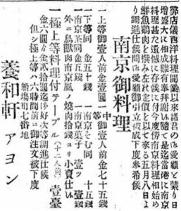 “南京料理”とは、当時の中華料理全般を指す呼び名だ。つまり、養和軒は中華料理も出す西洋料理店だったのだ。「アヨン」とあるのは創業者の陳阿龍(ちん・あよん)のことで、イギリス領事官の専属料理人を務めていた人物だ。彼が独立して開いた店であるから、馴染み客として領事館のイギリス人も多数訪れていたはずだ。
